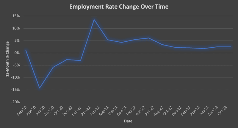 Although the unemployment rate has steadily been decreasing since its peak in 2020, it rose to 6.4% in June 2024 and has been trending up since April 2023, rising 1.3% during that period. Higher unemployment rates lead to rate cuts.