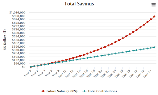 If you’re just getting started at 30 and you’re able to invest $900 each month in accounts or investments that yield a 5% annual return, you would have just over $980,000 by the time you’re ready to retire at 65!